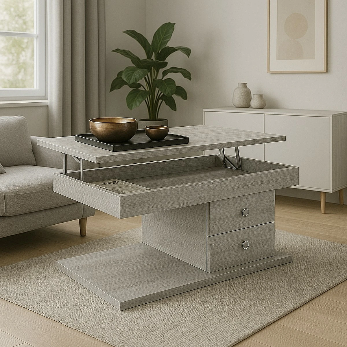 La mesa de centro elevable con cajones es una pieza pensada para quienes valoran tanto el diseño como la funcionalidad. Su estructura compacta encaja fácilmente en salones de todos los tamaños, y su estética moderna la convierte en un punto focal decorativo. Los acabados disponibles —blanco, cambrian y tibet— permiten combinarla con sofás claros, muebles de madera o ambientes más sobrios.