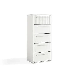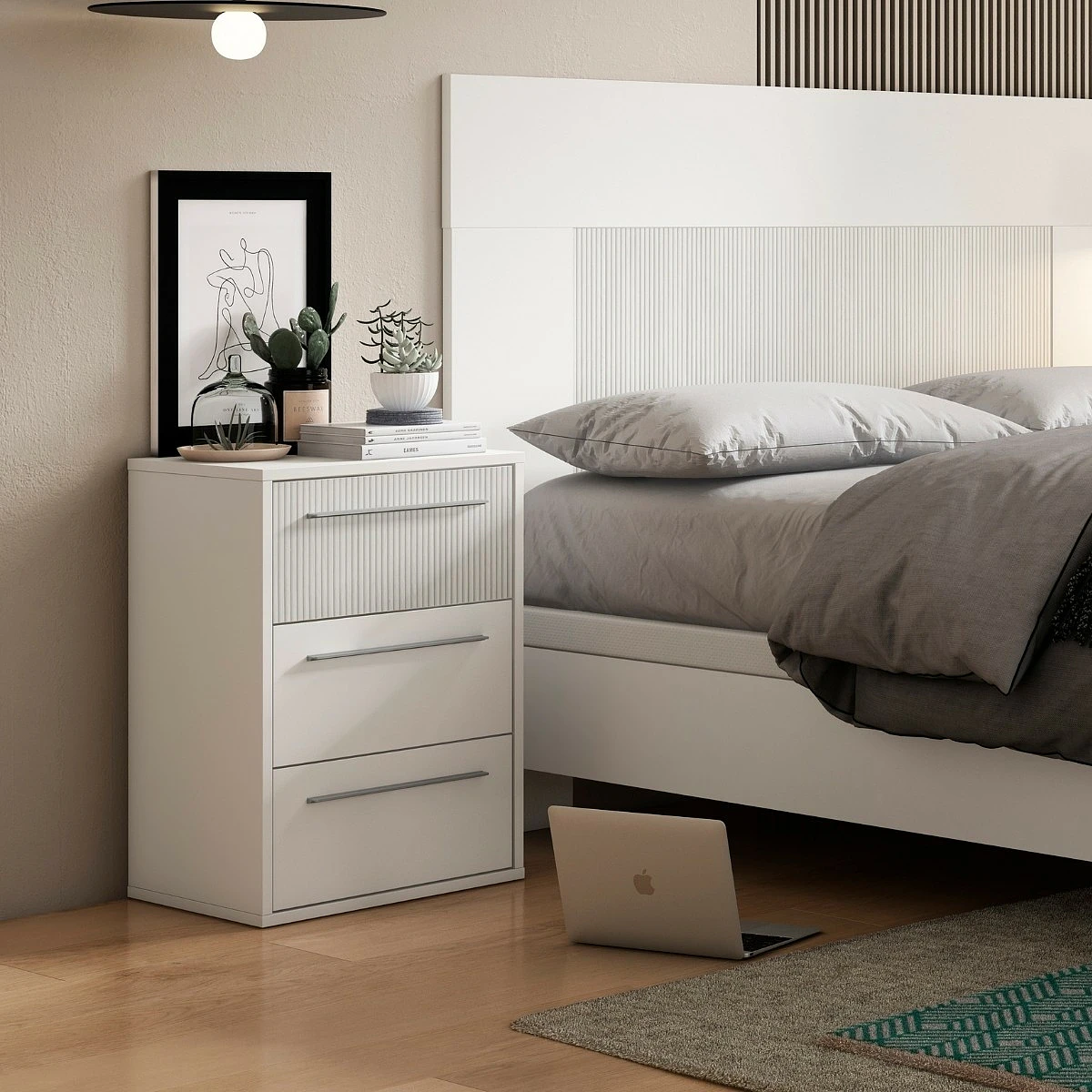 El acabado blanco aporta luminosidad, mientras que el detalle en savana claro con textura estriada en el cajón superior introduce una nota decorativa sutil que rompe con la monotonía y añade personalidad al conjunto.