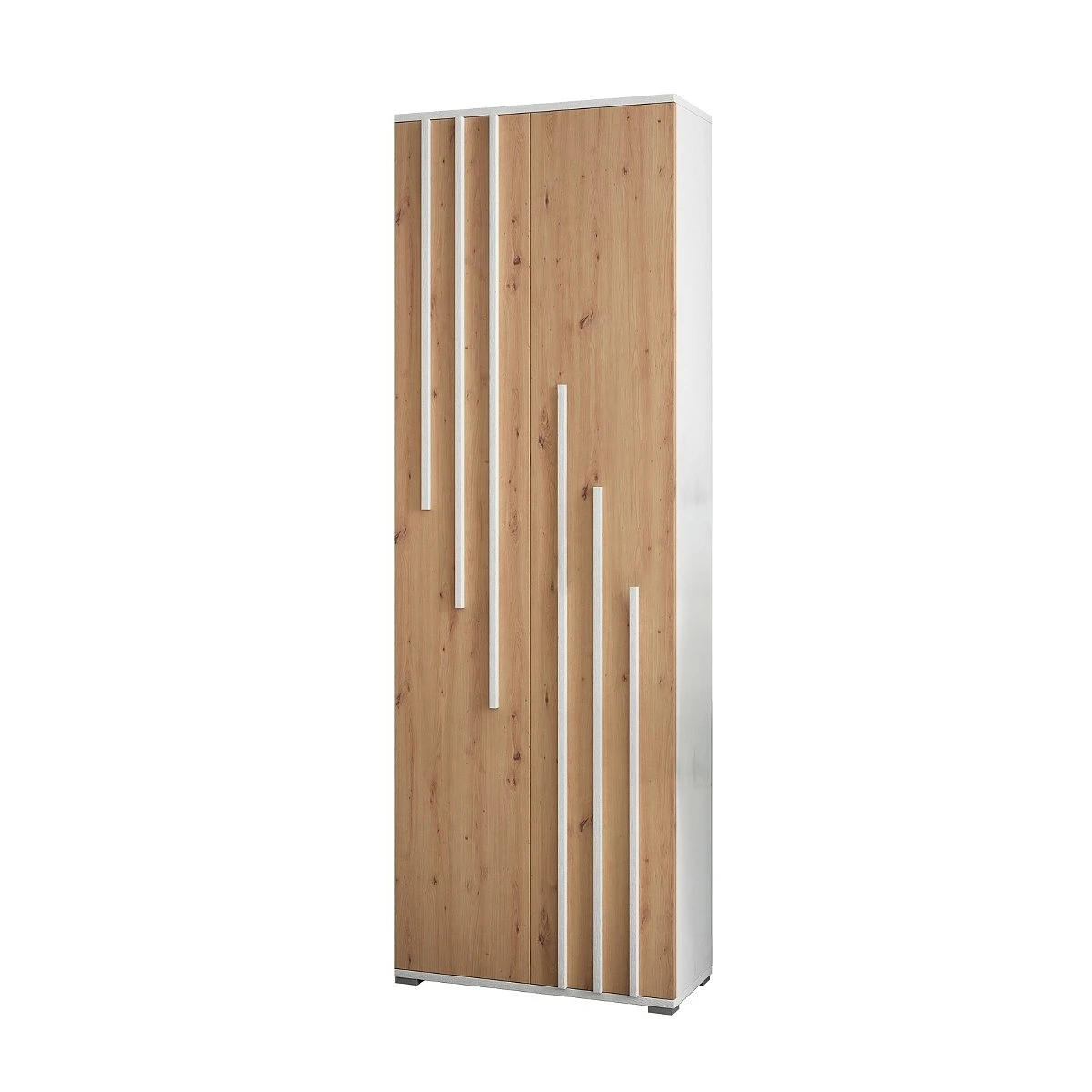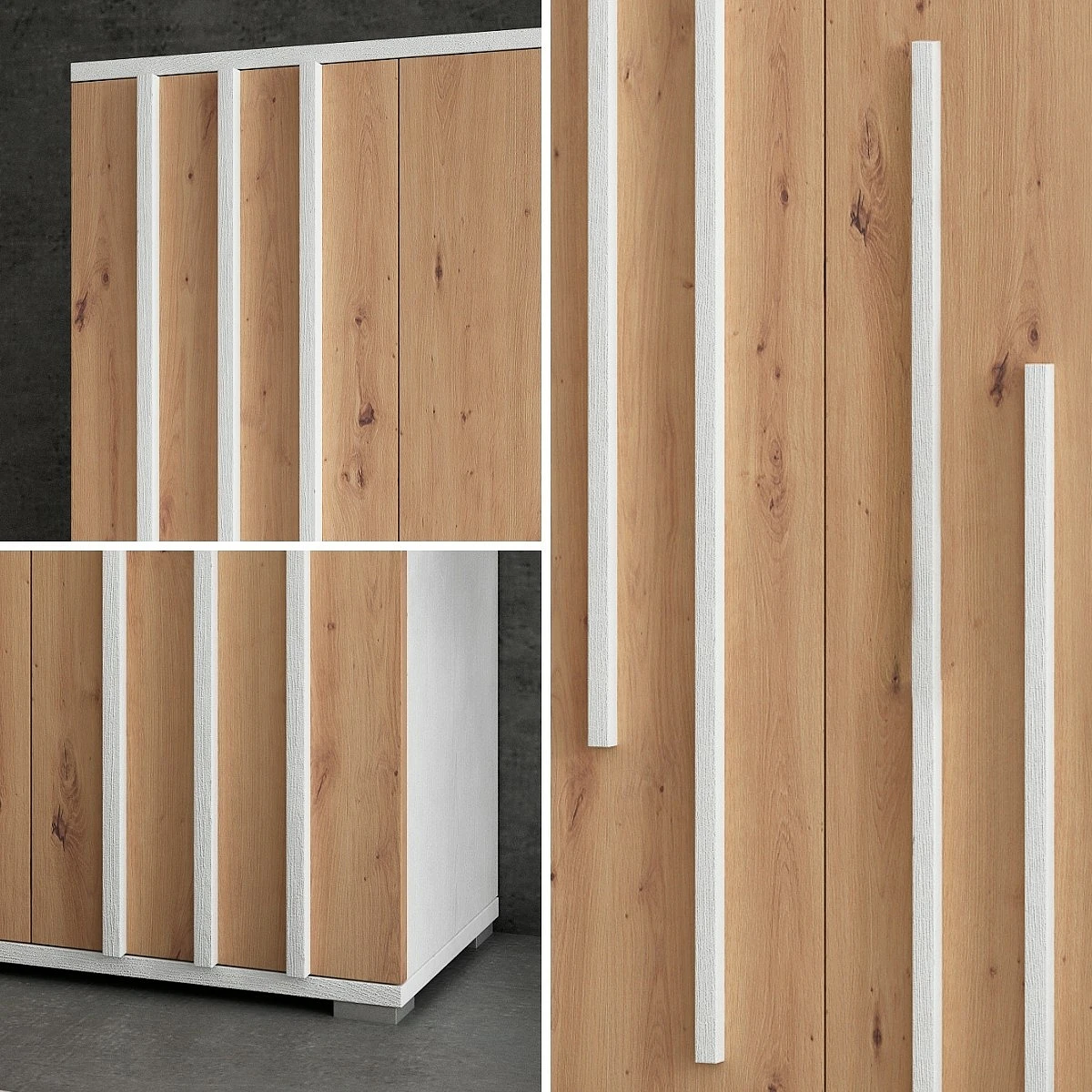 Su acabado en roble natural aporta calidez, mientras que los detalles en blanco realzan su silueta, aportando un toque moderno y fresco que combina con distintos estilos de decoración.