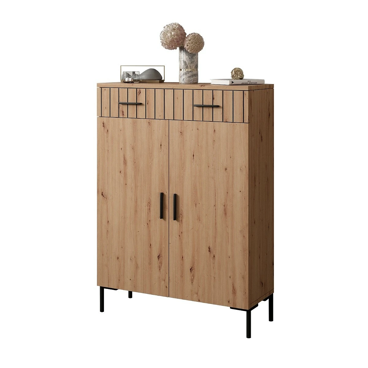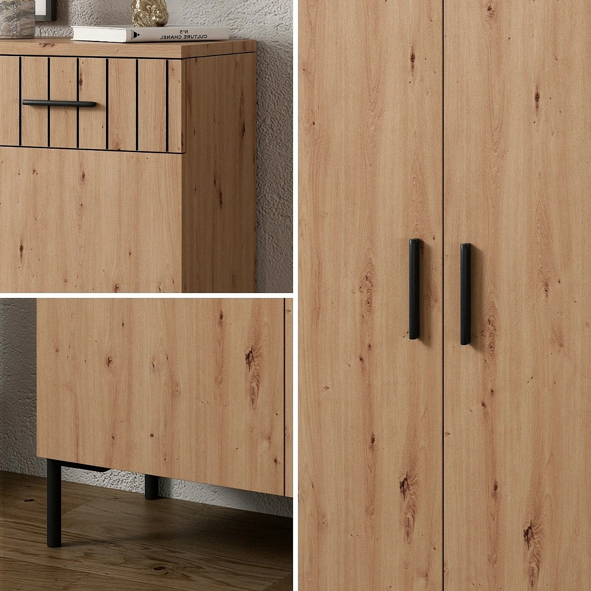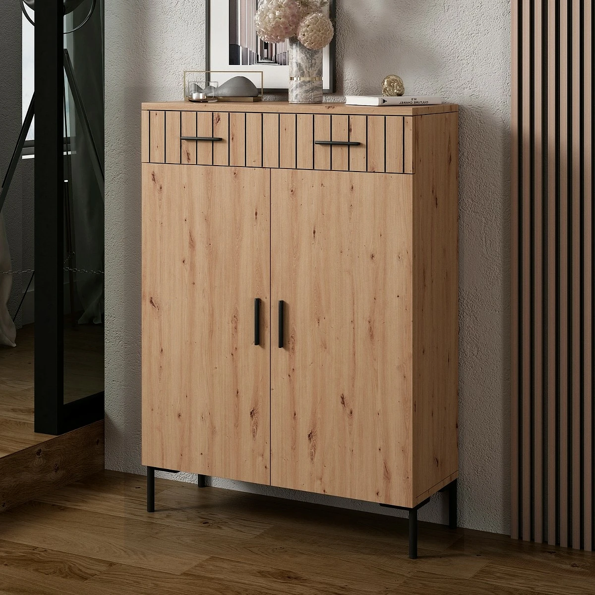 • Las dos puertas inferiores ocultan baldas interiores perfectas para guardar hasta 16 pares de zapatos, dependiendo del tamaño.