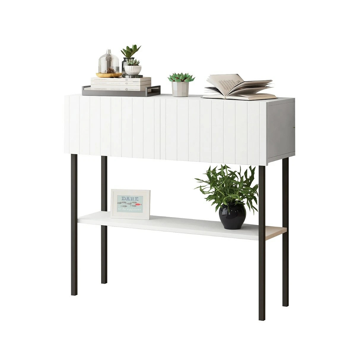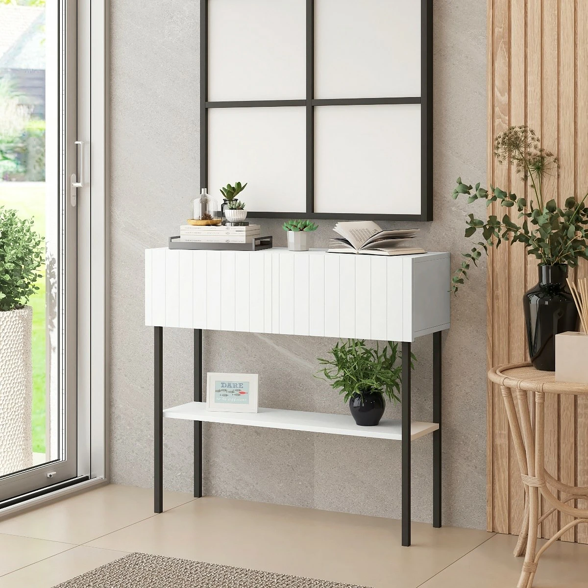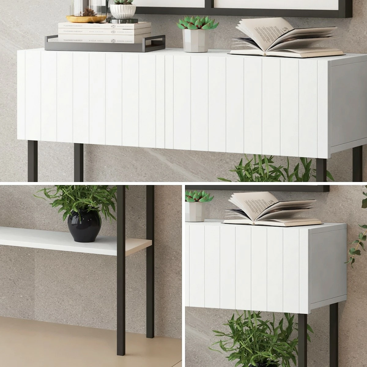 Con su diseño limpio y su acabado blanco mate, esta consola ayuda a crear espacios visualmente amplios y acogedores. Es ideal para hogares con decoración nórdica, moderna o escandinava. Los listones decorativos en el frontal añaden textura sin recargar el diseño, logrando un equilibrio perfecto entre sencillez y estilo.