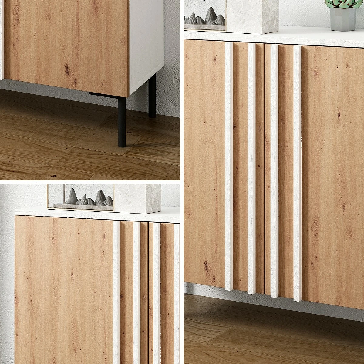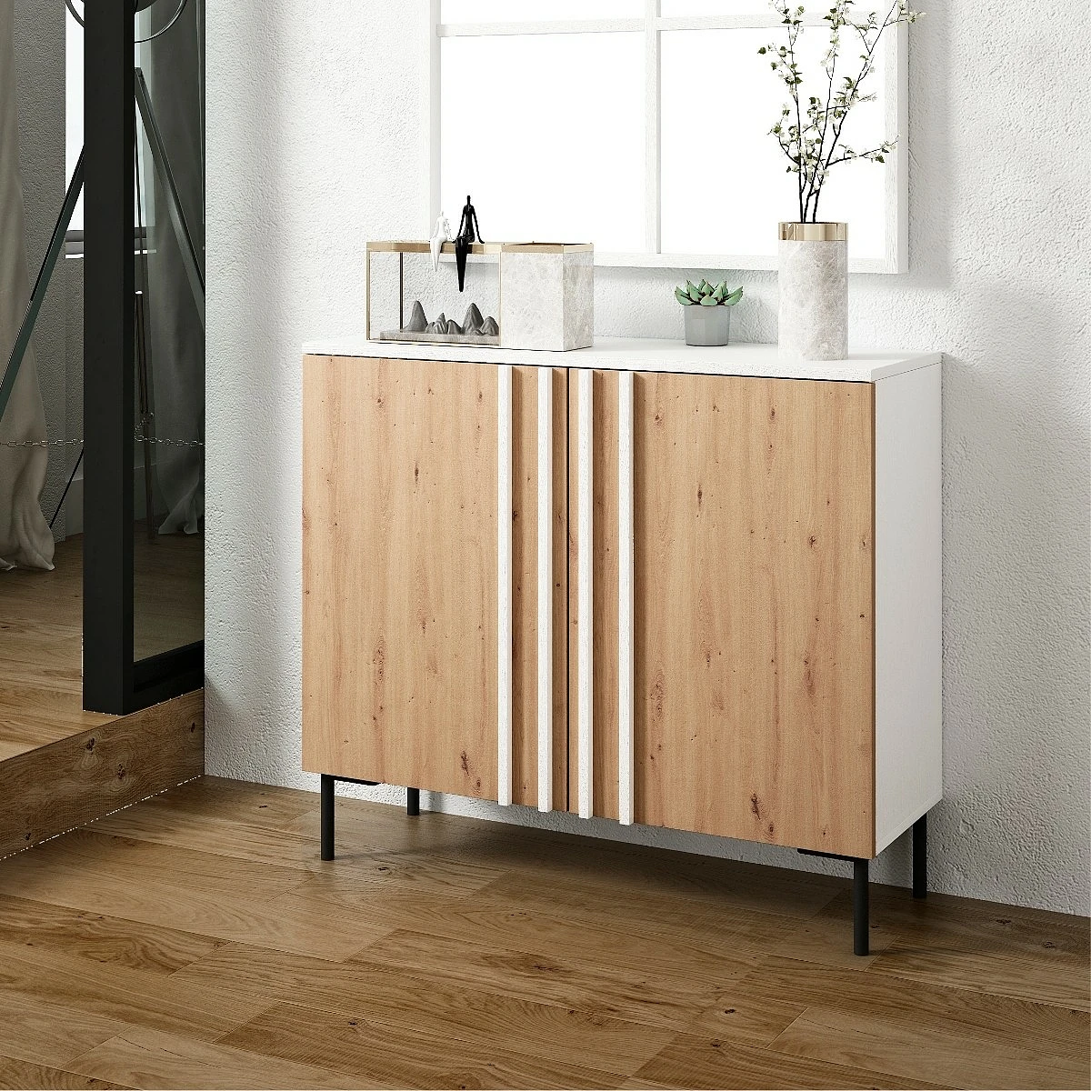 El diseño de esta consola destaca por su frontal decorativo, donde las molduras verticales en blanco integran los tiradores y generan un ritmo visual atractivo. Esta característica no solo aporta un toque de diseño, sino que también facilita el uso diario sin romper la estética del mueble.
