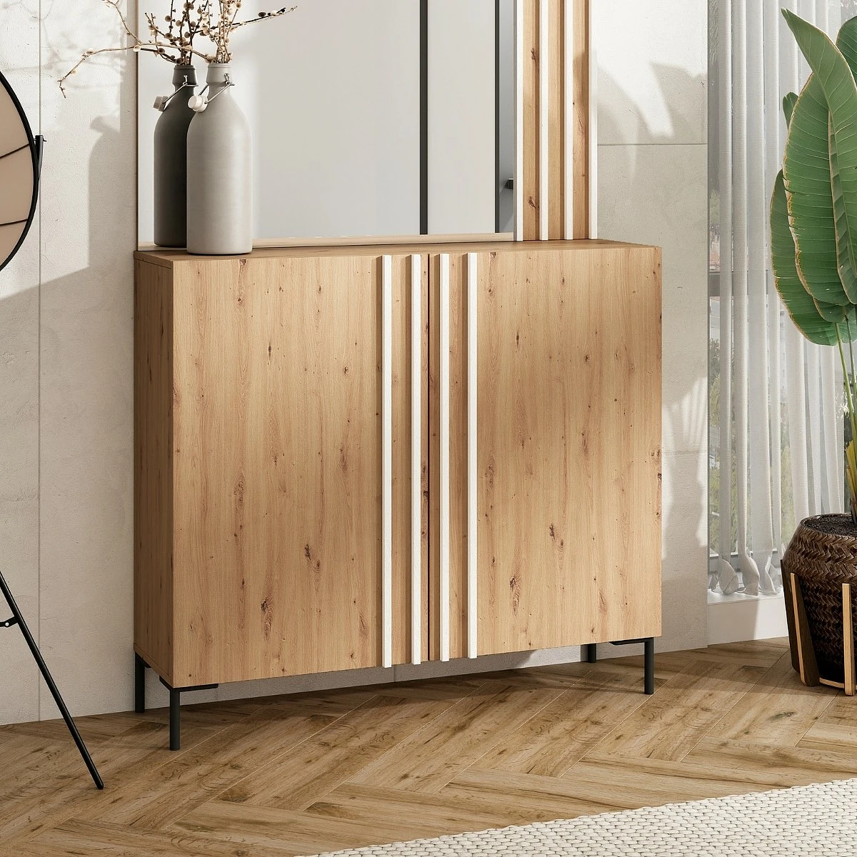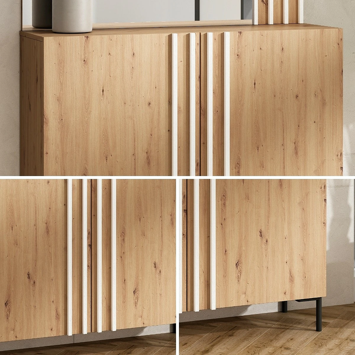 El acabado en roble Amazona de esta consola aporta un toque de calidez y textura natural al ambiente. Su frontal está decorado con molduras verticales en blanco, que no solo realzan el diseño, sino que también cumplen la función de tiradores integrados, aportando limpieza visual al conjunto.