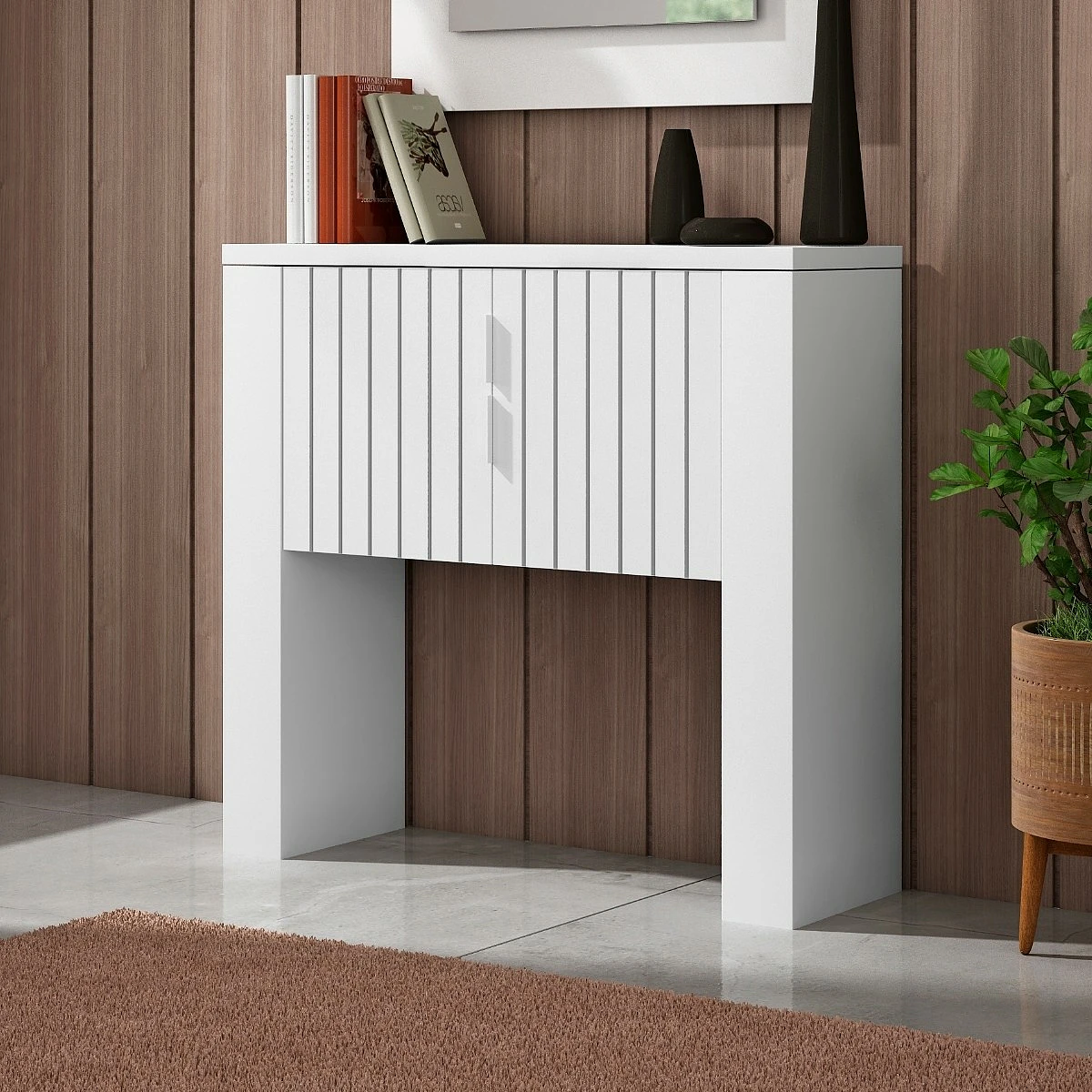 La Consola Blanca 80x76x27 cm se caracteriza por su diseño elegante y discreto. Las puertas frontales con delicadas líneas verticales en relieve crean un efecto visual atractivo sin sobrecargar el ambiente. Su acabado en blanco puro se integra fácilmente en cualquier estilo de decoración, desde los más clásicos hasta los más modernos.