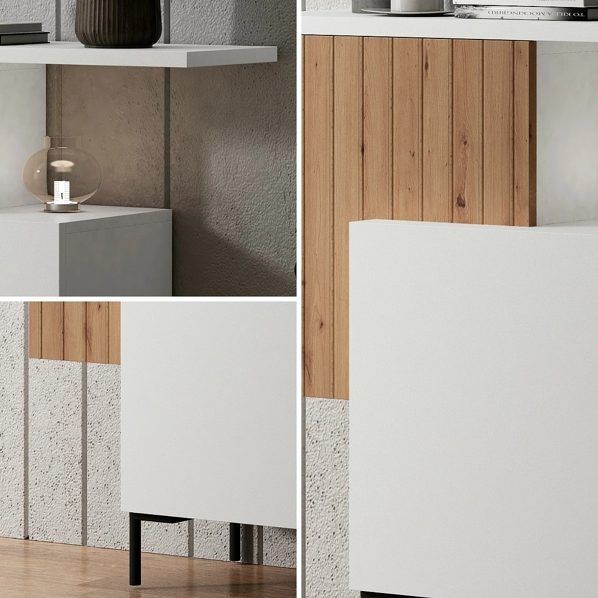 Combina MDF de alta calidad con un acabado en blanco, listones en roble natural y patas metálicas negras para mayor estabilidad y estilo.