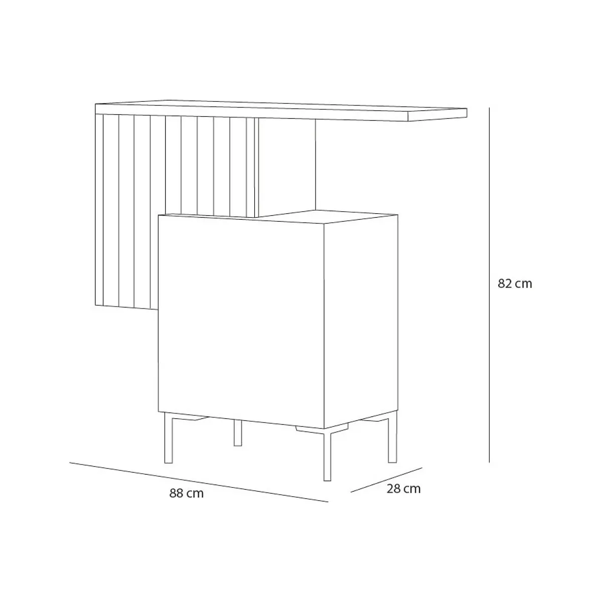 La consola dispone de una puerta en roble natural que oculta un práctico espacio interior para almacenar objetos fuera de la vista, manteniendo el orden en casa. Su superficie superior ofrece espacio adicional para colocar libros, marcos decorativos, lámparas o plantas.