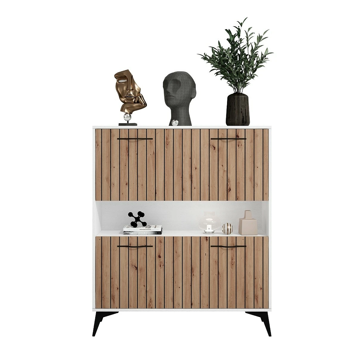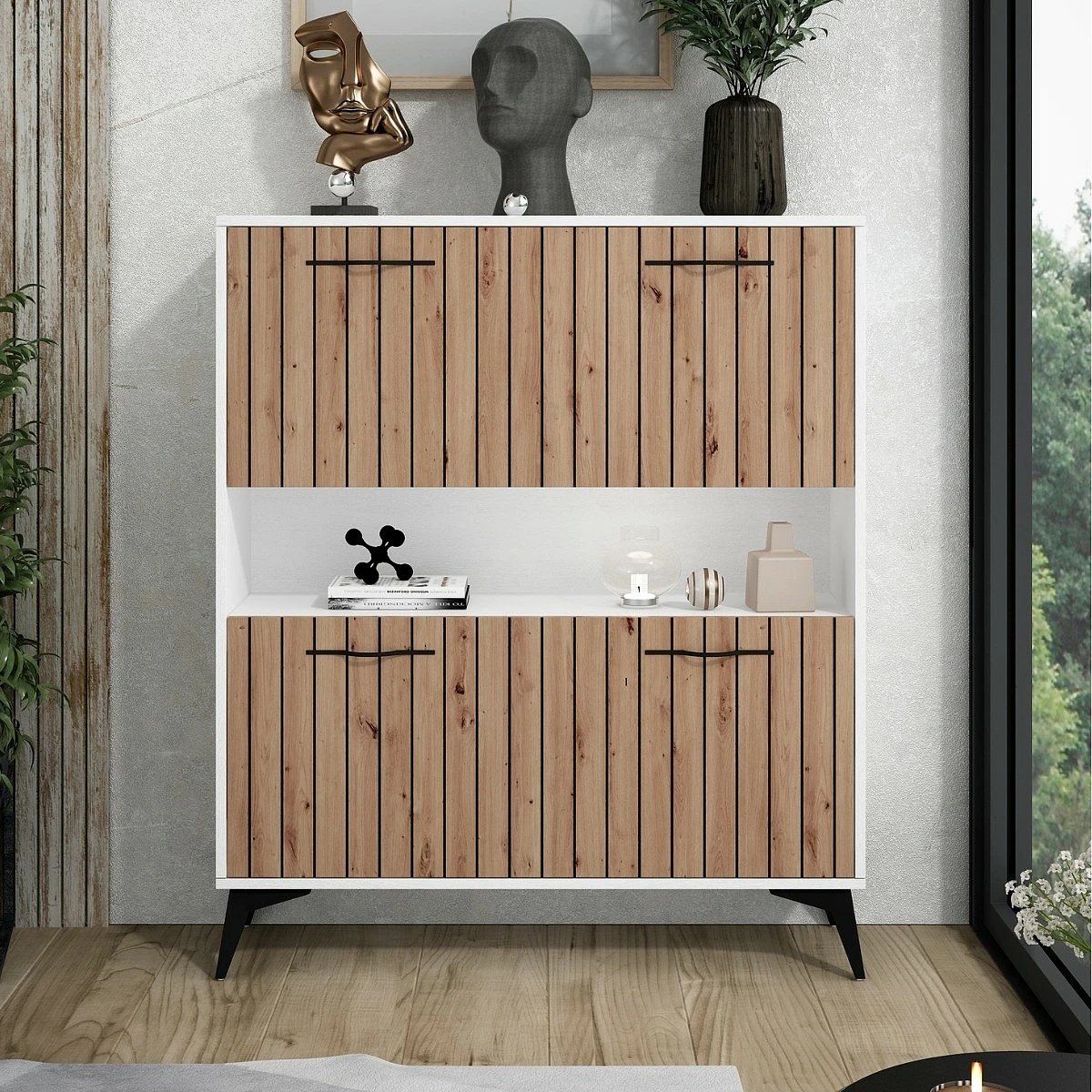 El diseño del mueble incorpora cuatro puertas con estantes interiores, perfectas para mantener organizados objetos como vajilla, textiles, libros o documentos. Además, el hueco central abierto es ideal para exhibir piezas decorativas, velas o tus libros favoritos.