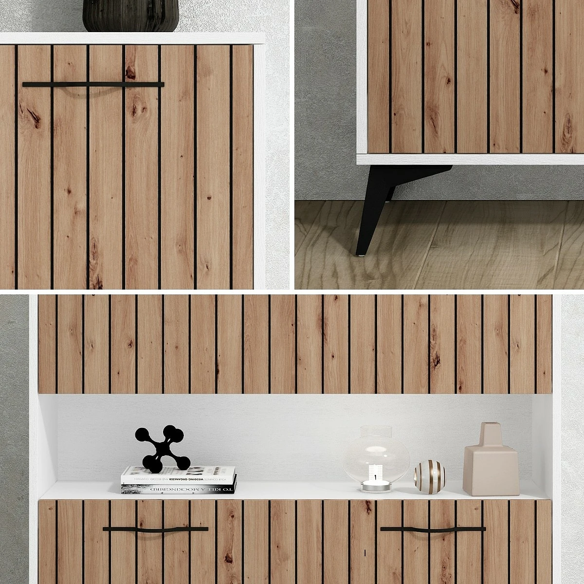 Está fabricado en MDF de alta calidad con acabado en roble natural con detalles en blanco, puertas listonadas y patas metálicas negras.
