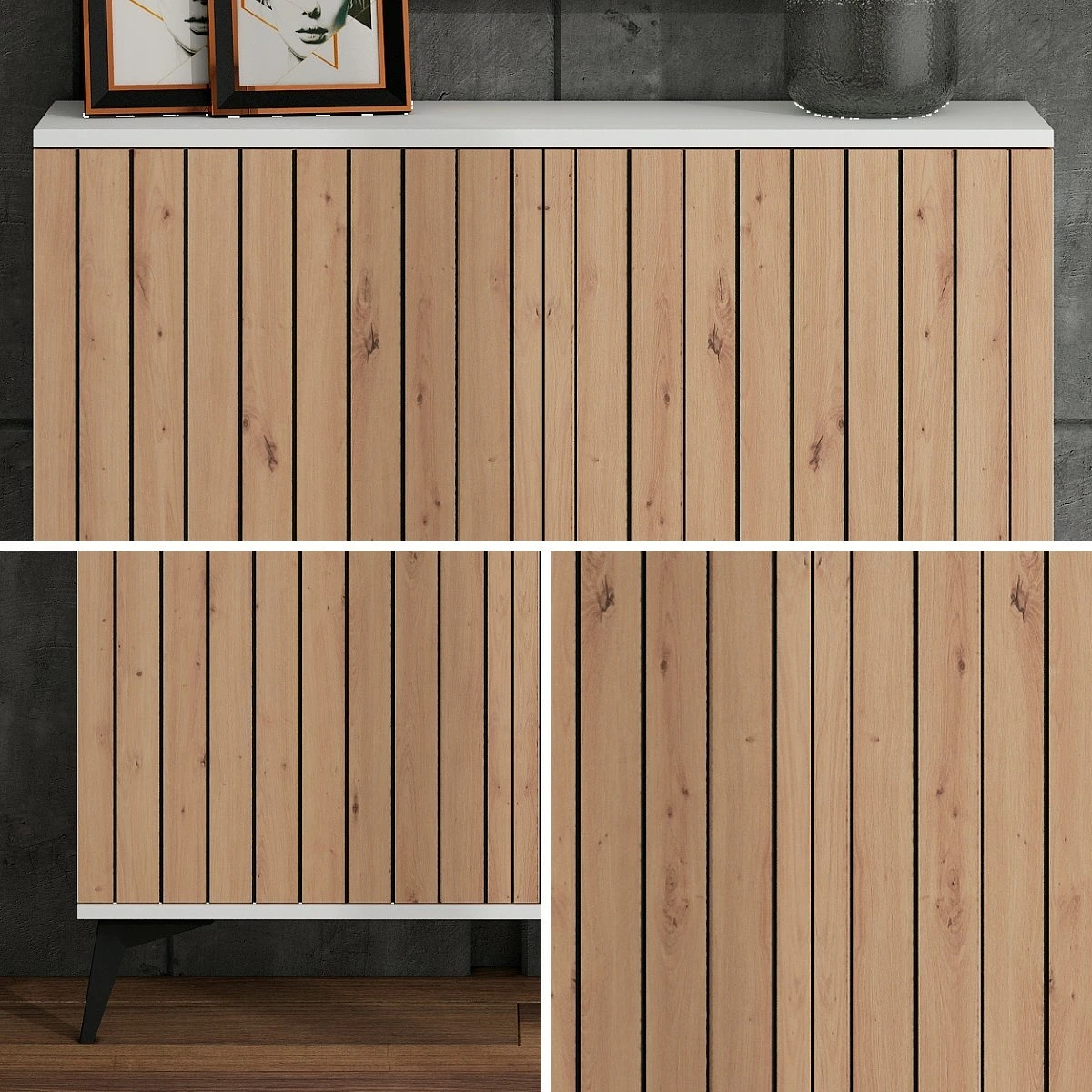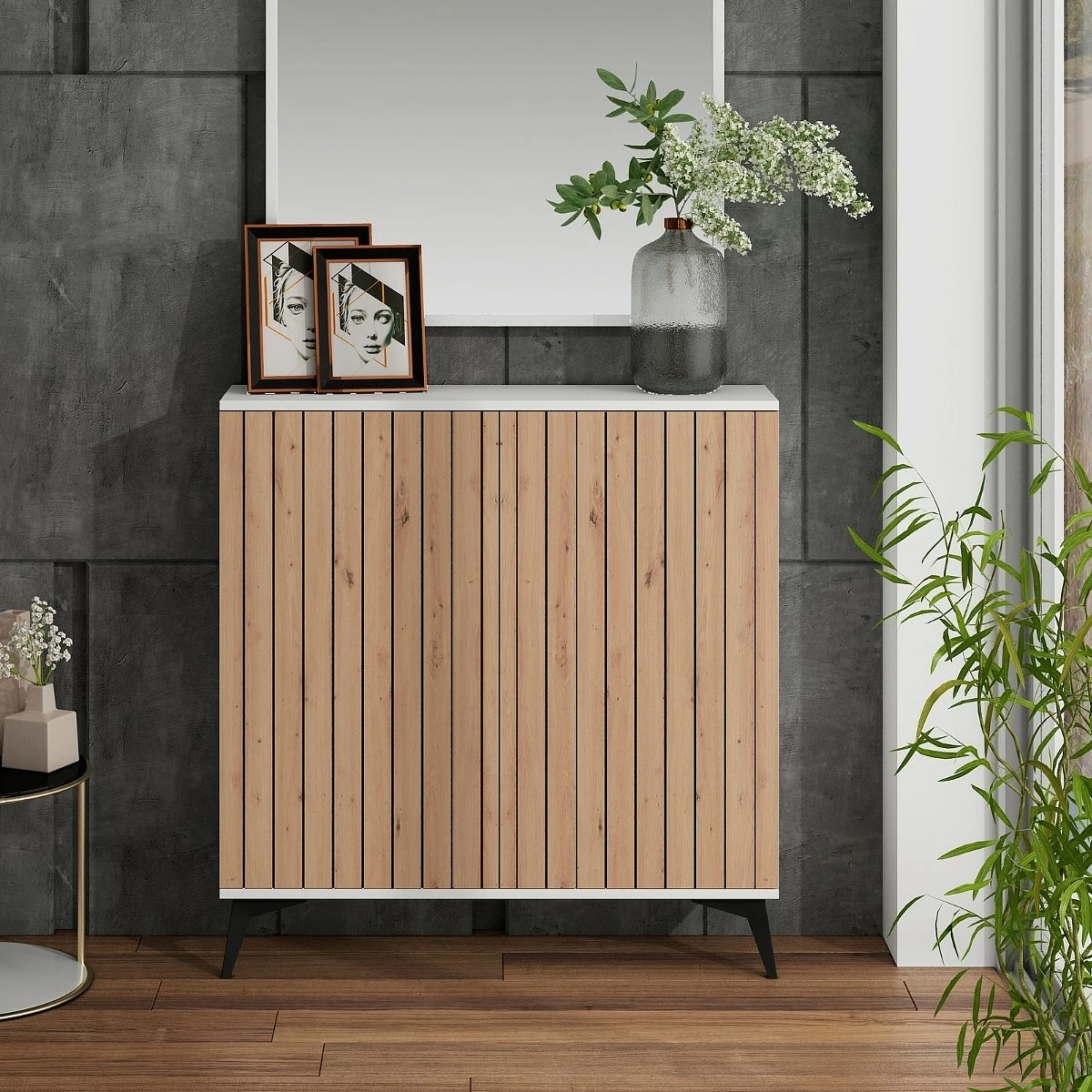 Este auxiliar de roble y blanco destaca por su diseño compacto que combina practicidad y estética. Su frontal con lamas verticales aporta textura y un aire moderno, mientras que las patas metálicas negras elevan su silueta, aligerando visualmente el espacio.