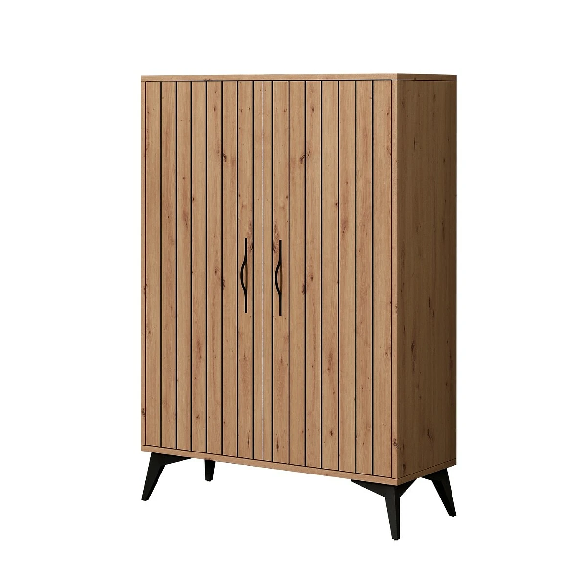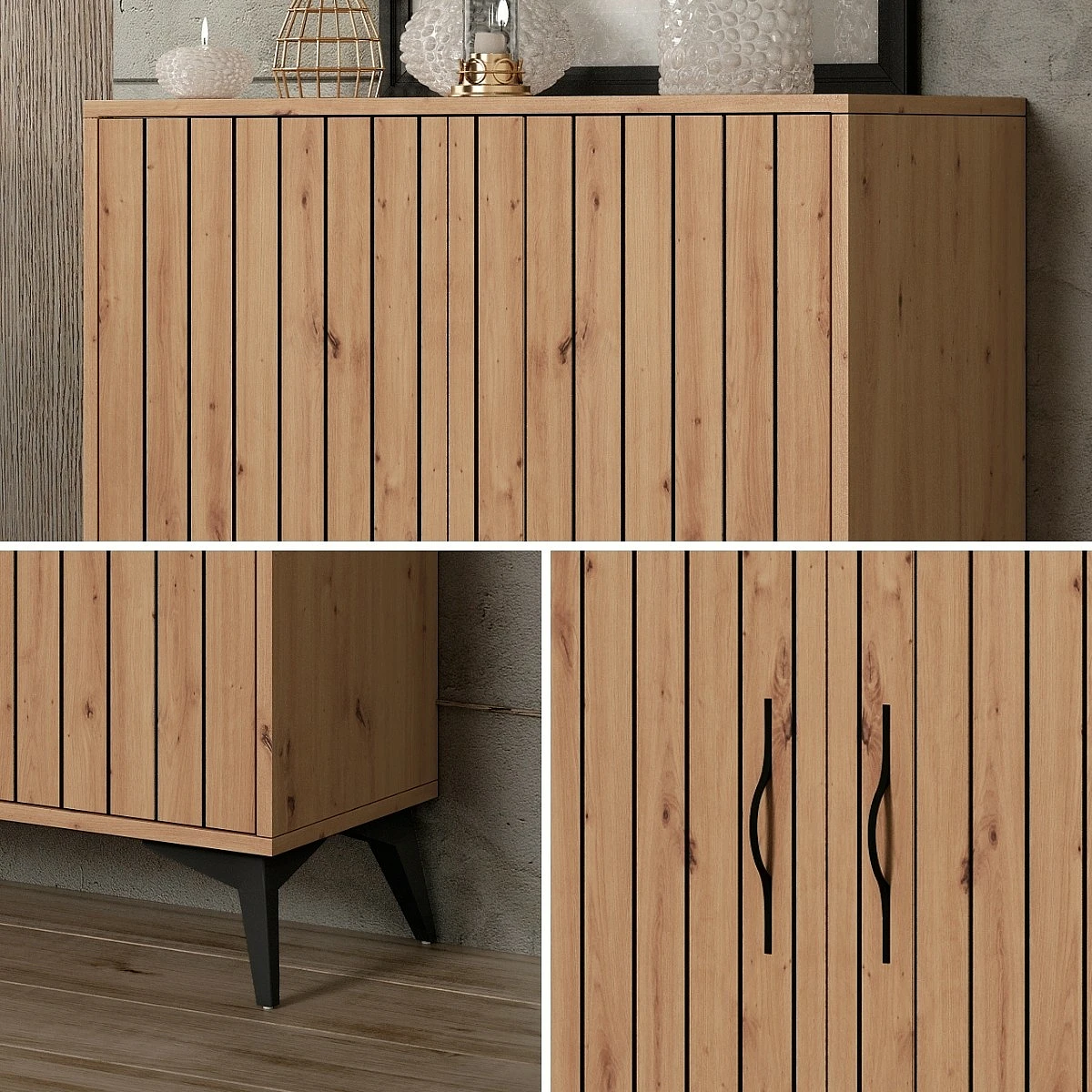 El diseño de lamas verticales no solo aporta un estilo visual atractivo, sino que también da sensación de altura, haciendo que el mueble luzca más esbelto y ligero. Las patas metálicas negras elevan la estructura para facilitar la limpieza y aportar un toque contemporáneo.