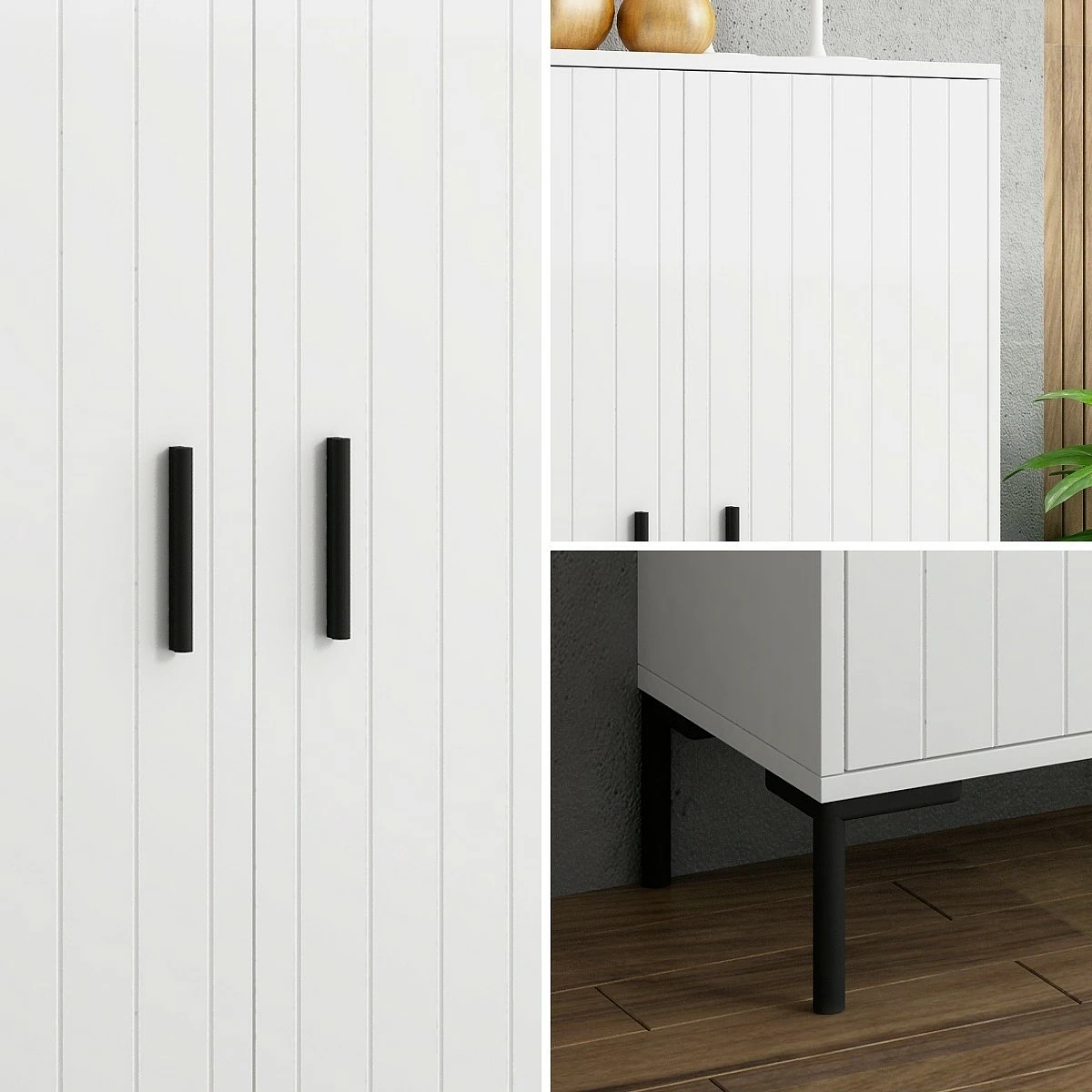 Su diseño con líneas verticales decorativas realza el frontal, mientras que las patas metálicas negras aportan estabilidad y un contraste que destaca en cualquier estilo decorativo.