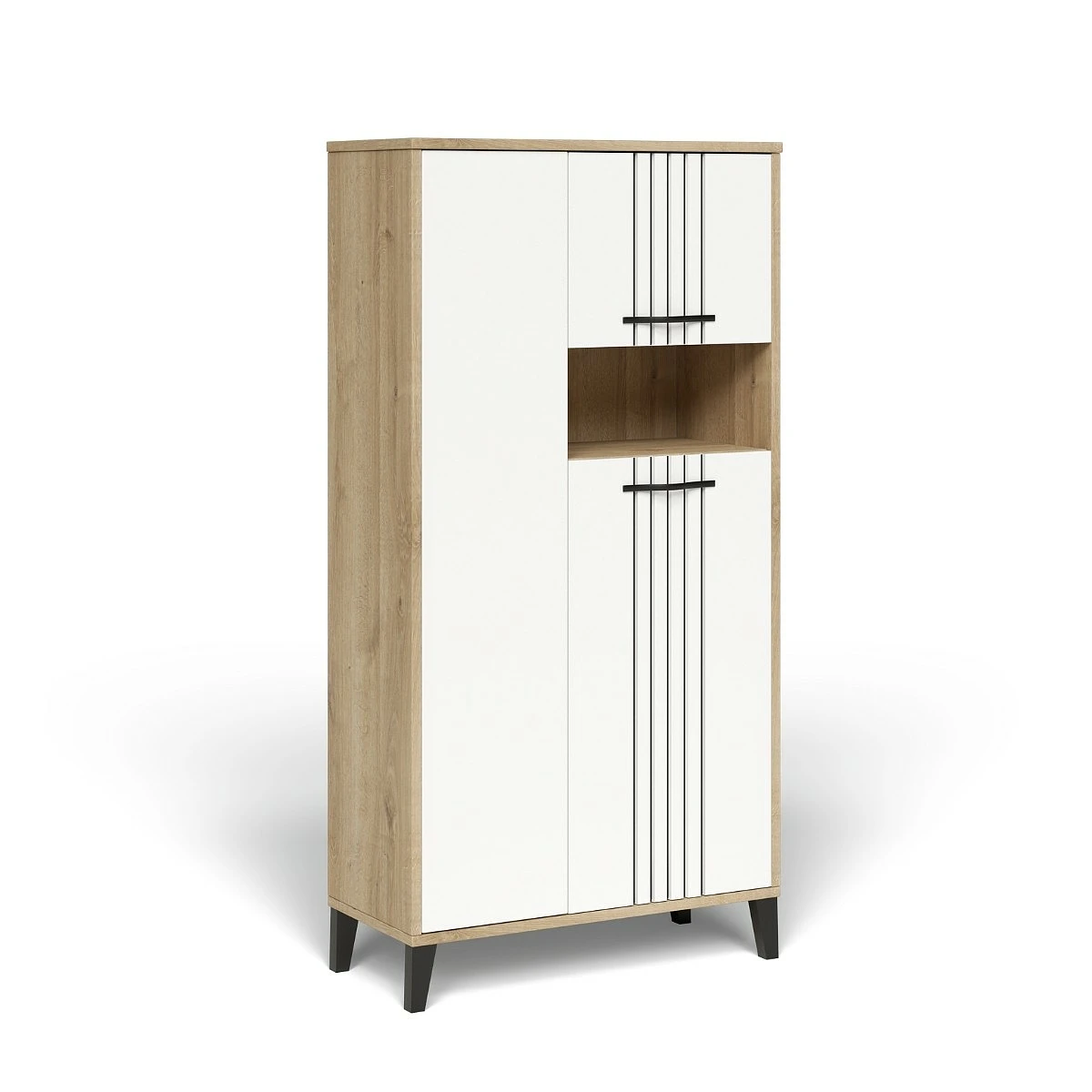 Gracias a su formato alto y estrecho, el bodeguero Dakota permite aprovechar al máximo la altura de la estancia sin ocupar demasiado espacio en el suelo. Es ideal para salones, cocinas auxiliares, comedores o incluso pasillos amplios. Su diseño frontal con listones decorativos verticales y tiradores negros realza el estilo moderno del mueble.