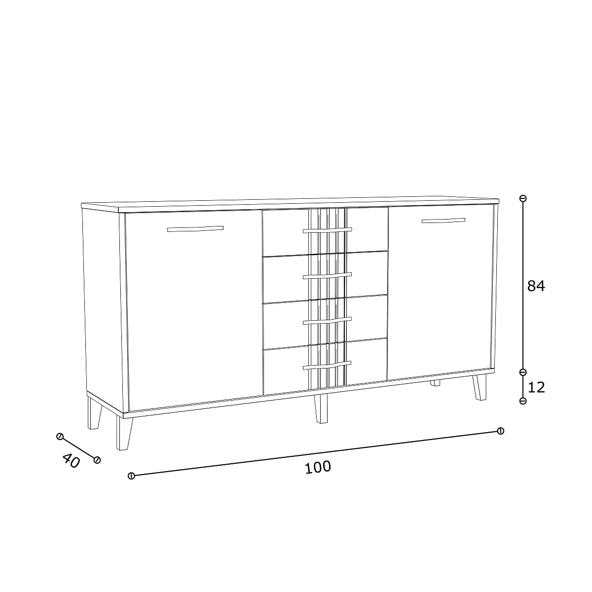 Cada tirador metálico en color negro ha sido seleccionado para reforzar el carácter moderno del aparador. La melamina de alta resistencia garantiza durabilidad y fácil limpieza, ideal para el uso diario. Su diseño frontal incorpora un detalle de listones verticales decorativos sobre los cajones, que rompe la linealidad con un efecto visual atractivo y distintivo.