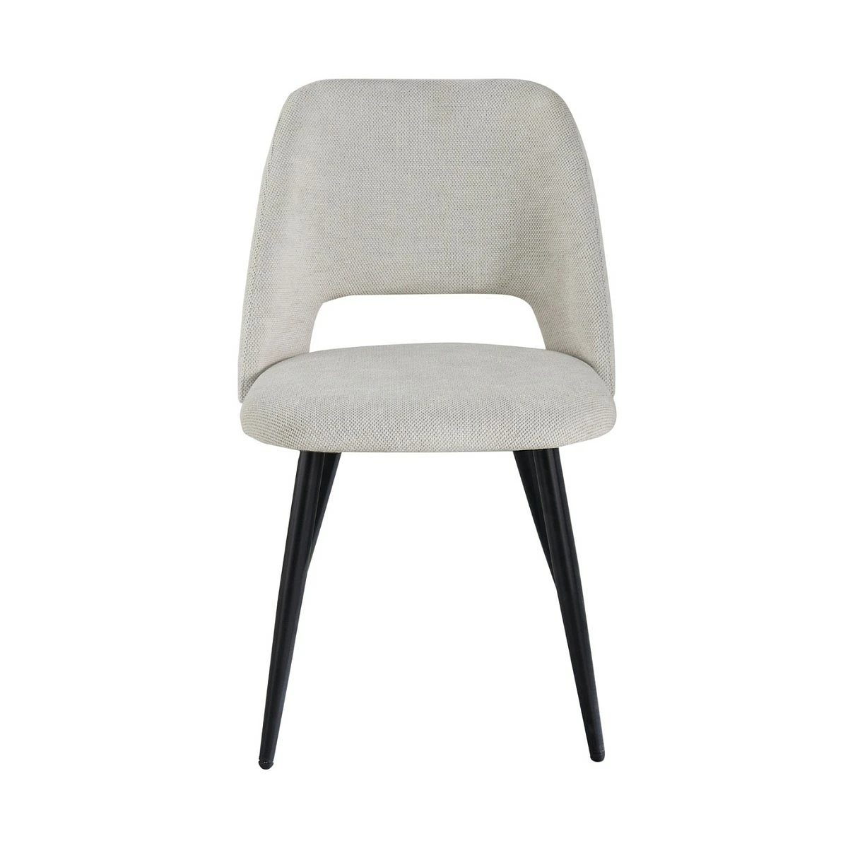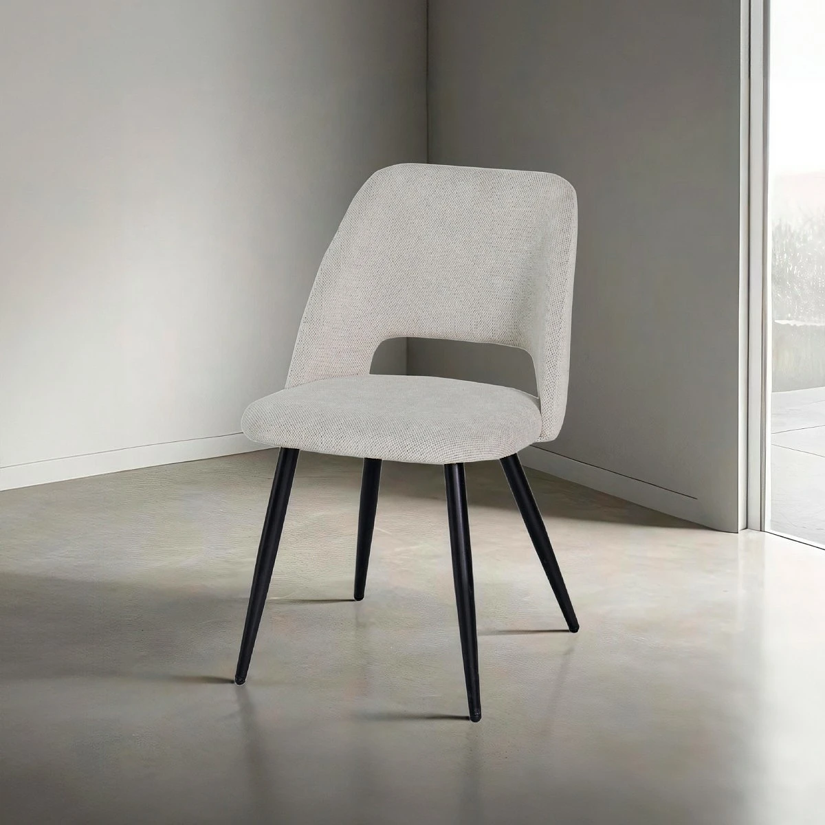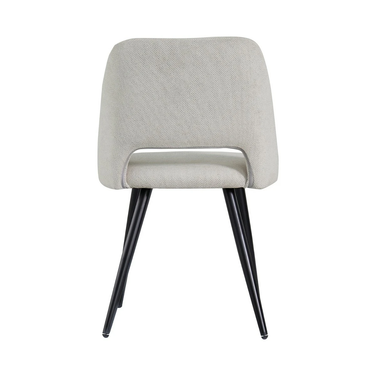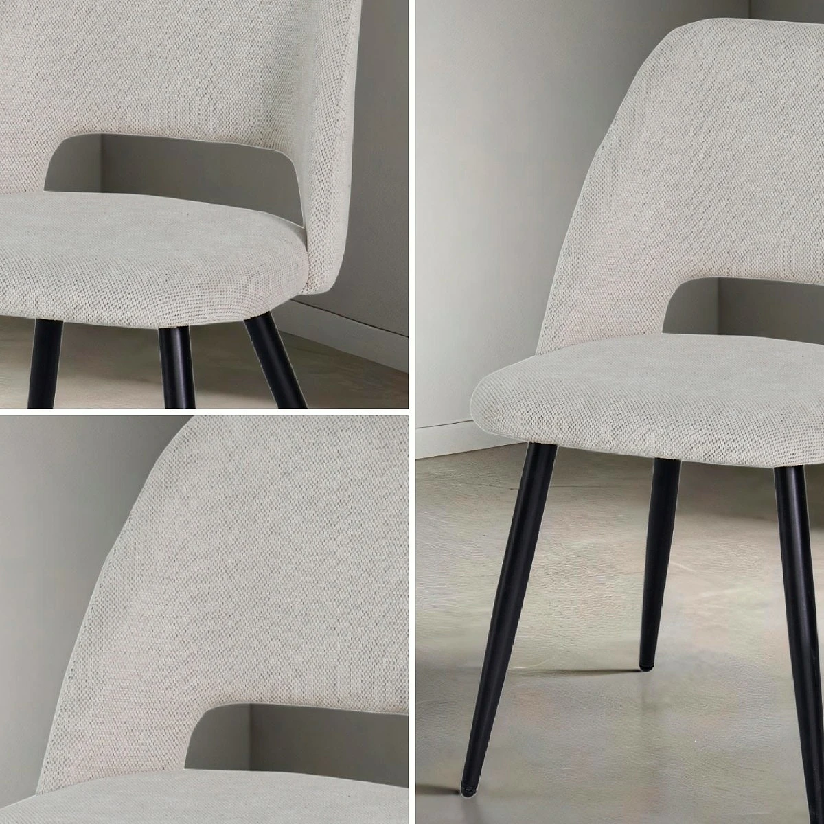 Aunque su diseño es visualmente delicado, la silla Flora cuenta con una estructura metálica firme que garantiza una excelente estabilidad. Las patas cónicas en negro mate contrastan con el tapizado, creando un efecto visual equilibrado y muy contemporáneo.