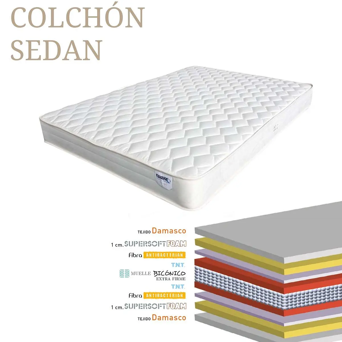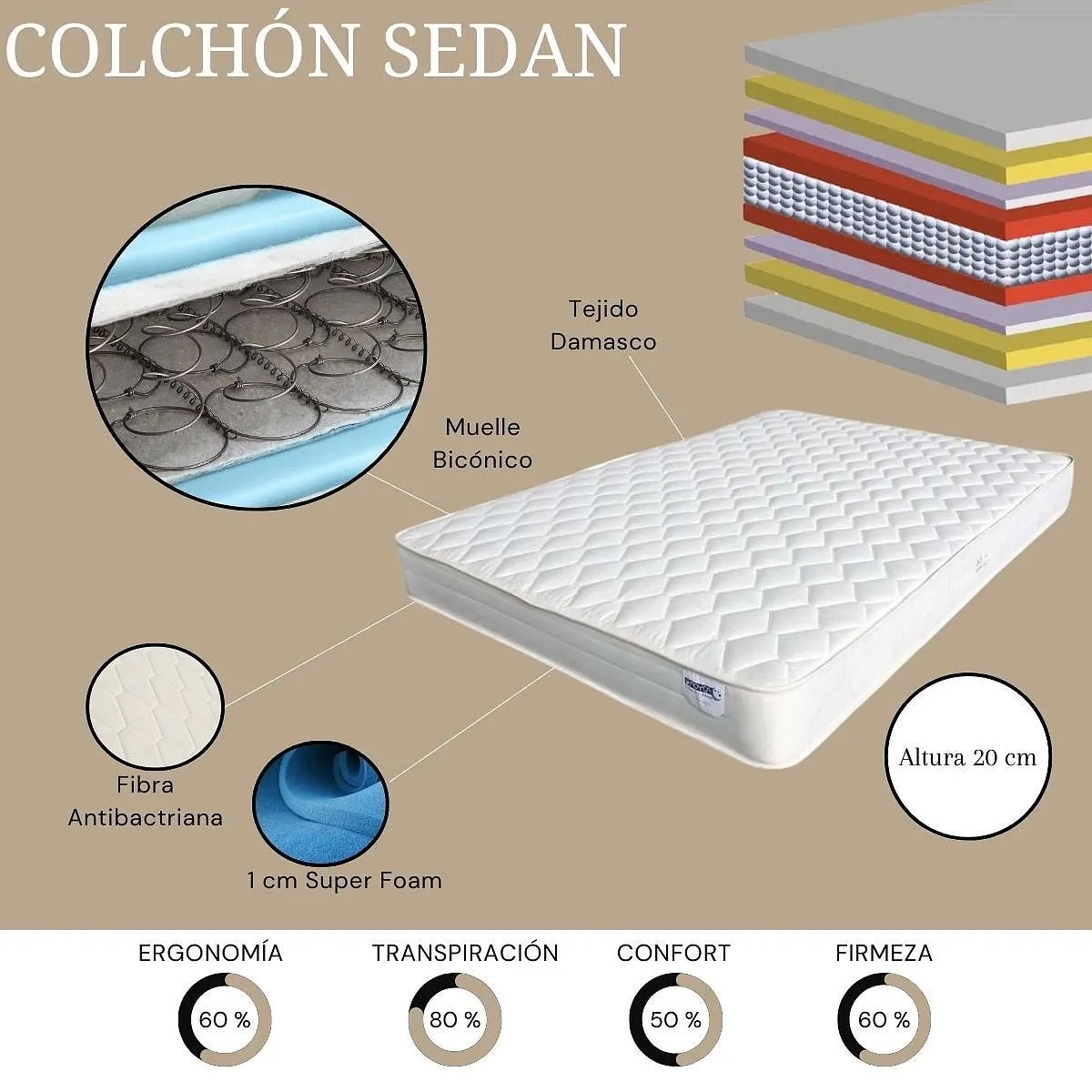 COLCHON SEDAN de muelles bicónicos con una altura de 20 cm, diseñado para brindar un descanso inigualable. Los muelles bicónicos garantizan un soporte firme y ergonómico,distribuyendo el peso de manera uniforme. El tejido damasco no solo es elegante, sino también suave al tacto. Este colchón combina durabilidad y comodidad.
