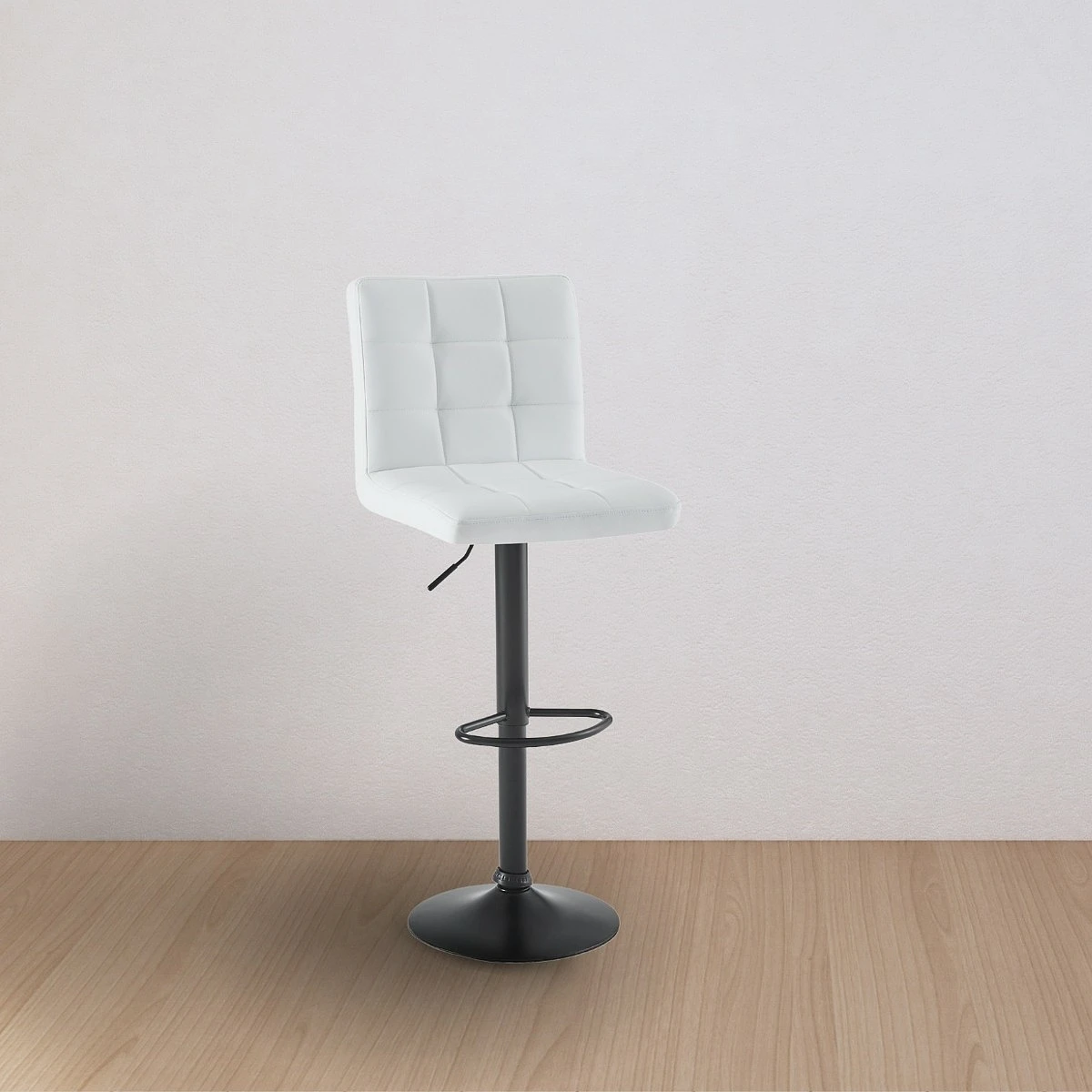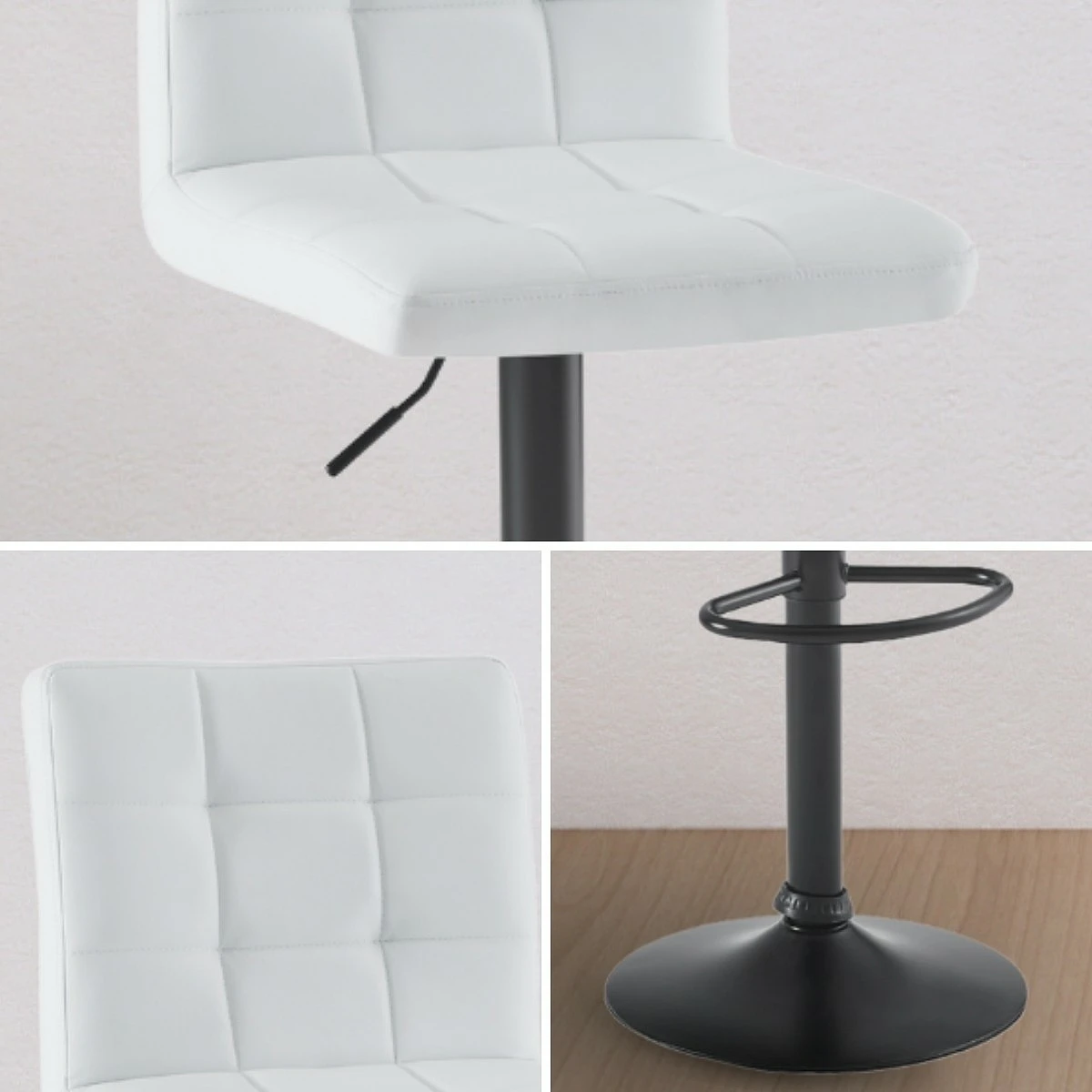 El asiento del Taburete Twin está tapizado en polipiel de alta calidad, un material resistente, fácil de limpiar y muy cómodo al tacto. Su textura acolchada con costuras decorativas tipo capitoné no solo añade un toque elegante, sino que mejora la comodidad al sentarse.